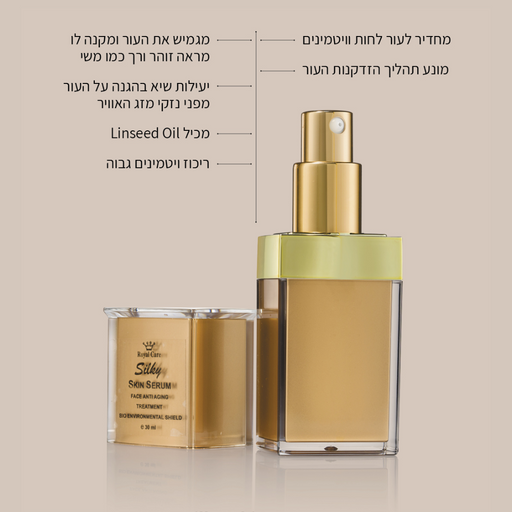 209.00 ₪סרום משי אנטיאייג'ינג סילקי סקין לעור הפנים 30 מ"ל רויאל קר - ROYAL CARE