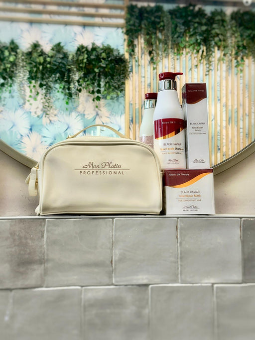 מארז לשיער מוחלק מון פלטין בלאק קוויאר שחור עם תיק רחצה יוקרתי - MON PLATINהערכה מועשרת בקוויאר שחור הידועה בסגולותיה הרבות לשיקום ושמירה לשיער שעב...